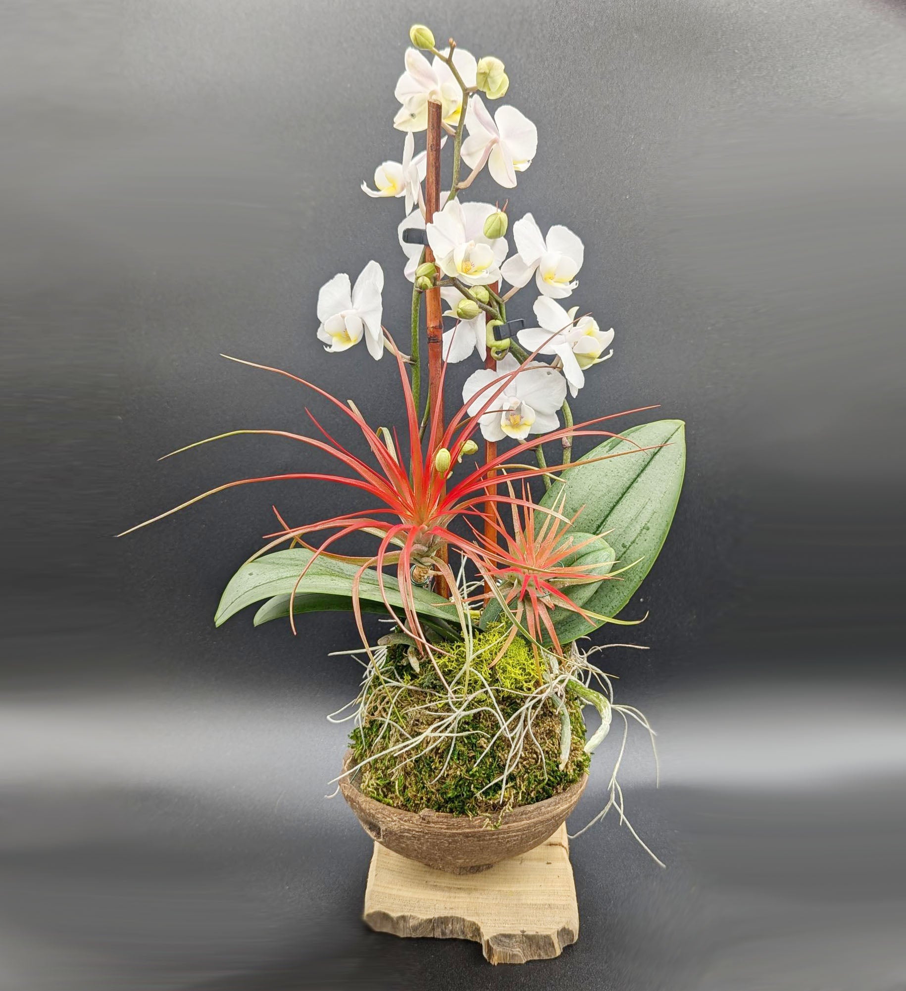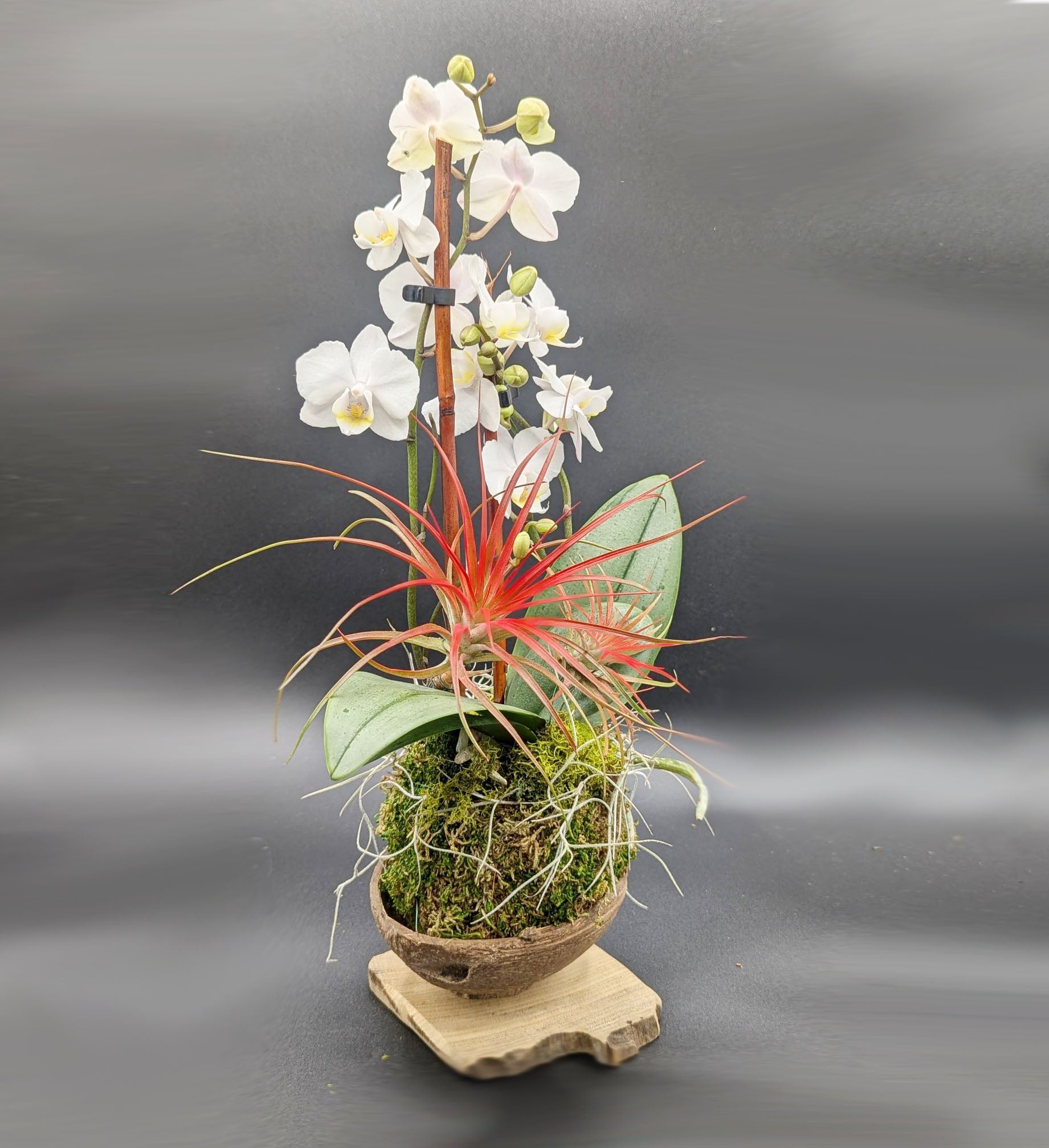 Blooming Orchid & Air Plant in Coconut Shell - Festive Seasonal Arrangement