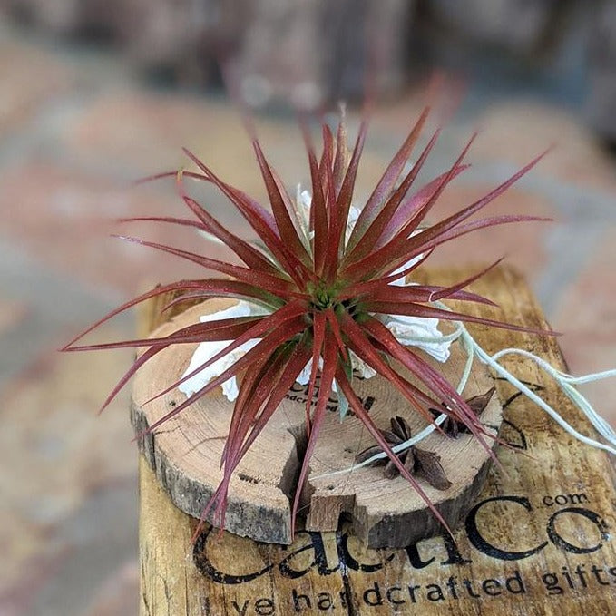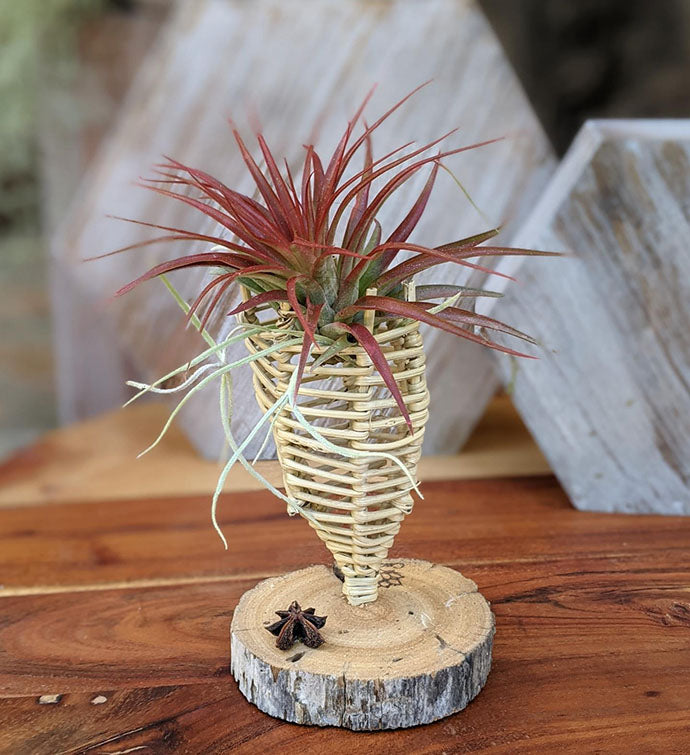 This unique handcrafted air plant arrangement features two stunning air plants: a large Brachycaulous Miniata and Tillandsia usneoides (Spanish Moss). The plants are beautifully nested in your choice of handcrafted vine cone, seashell, or cholla wood stand, all resting on a driftwood base plaque adorned with star anise seed pods. Each element is carefully handcrafted for a natural, rustic aesthetic that will enhance any indoor space.
